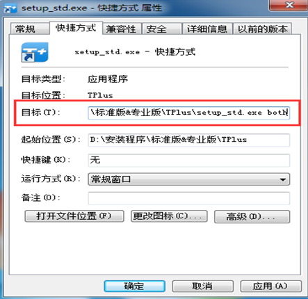 然后在桌面上找到该快捷方式后,右键属性,在目标中最后加入空格both后保存。