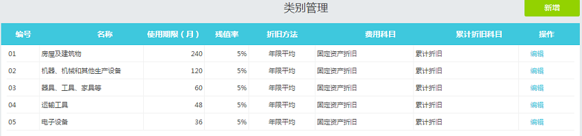 可根据需要,点击右上方“新增”按钮自行新增固定资产类别,方便固定资产管理界面信息调用。