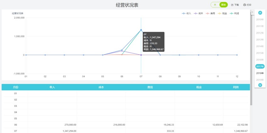 经营统计表,根据年度时间轴,展现该年度下各个月份的收入、成本、费用、税金、利润综合统计表。