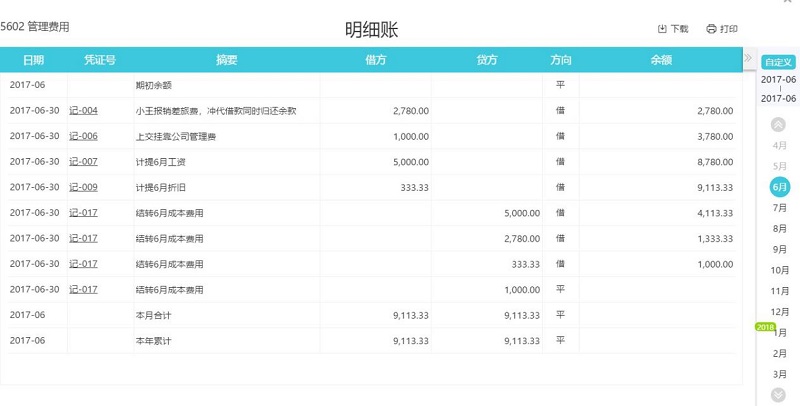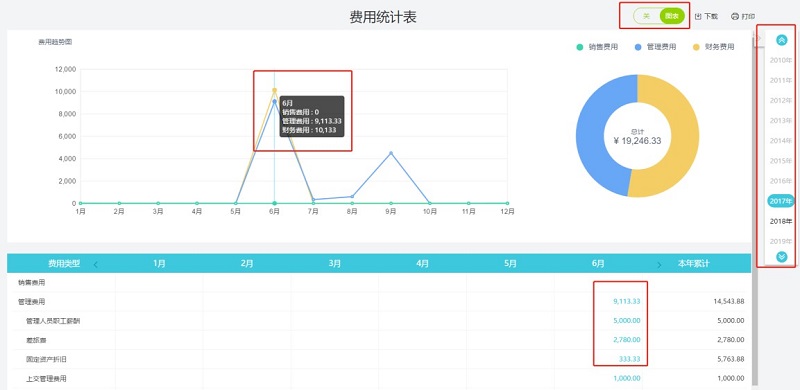 上方有图标曲线图展现,鼠标滑至某月节点时,出现当月的费用总分类金额统计。鼠标点击金额,可以打开明细账,并继续联查至凭证数据。如下图: