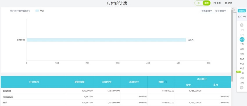 应付统计表,反映当前所选月份,各供应商的欠款情况,上方提供图标样式,可以选择关闭显示图标。