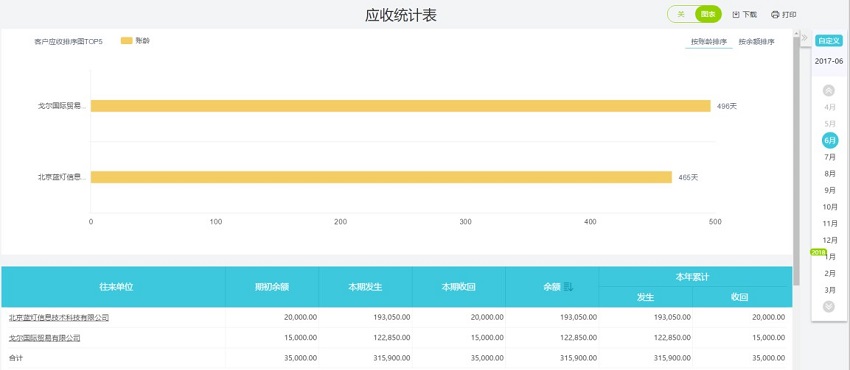 应收统计表,反映当前所选月份,各客户的欠款情况,上方提供图标样式,可以选择关闭显示图标。