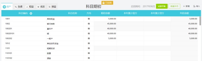 操作:设置-科目期初
