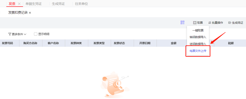 1、打开【发票】,鼠标停留在【取票】上,选择【电票文件上传】;