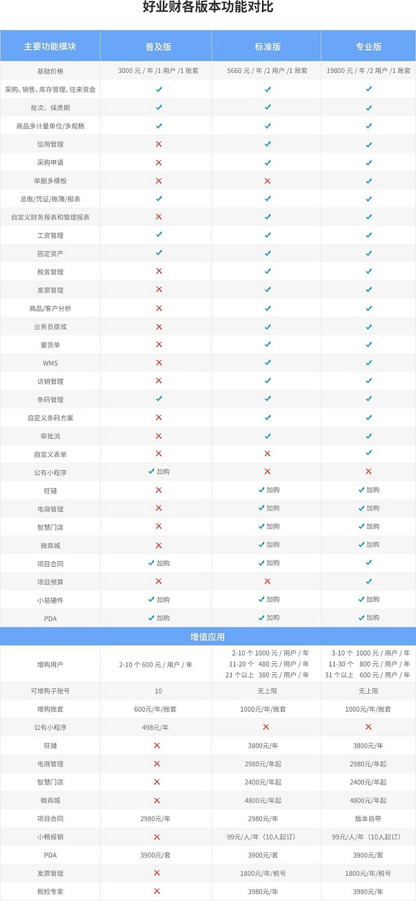 好业财标准版价格为5660元起,适合20人以上成长企业使用。产品区隔为精细化业财一体,包含普及版所有功能、营销功能、优惠券促销、经营数据分析、销售数据分析、利润报告、采购申请流程、业务员提成计算、客户新用管控、访销管理、审批流程、智能仓储wms、发票管理、条码管理等功能。