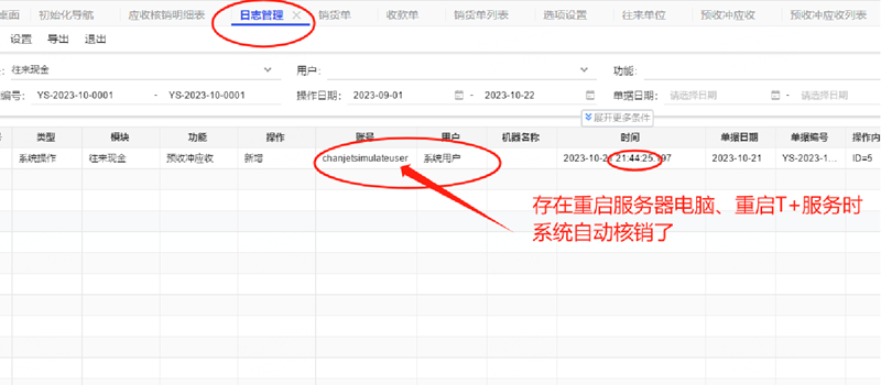 1、查看是否自动核销可以查看【系统管理】-【日志管理】,账号信息为系统user;