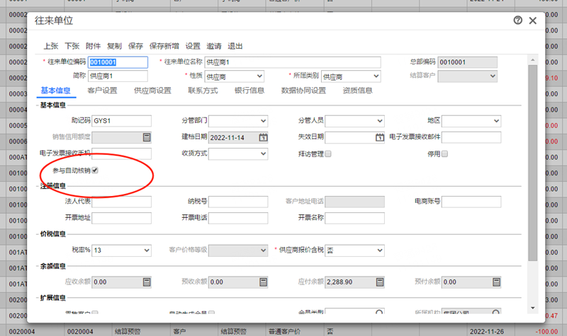 2、【基础设置】-【往来单位】-双击点开(往来单位),【基本信息】-勾选(参与自动核销)