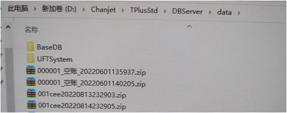 2、在数据库目录(默认D:ChanjetTPlusStdDBServerdata)下若存在正常的账套备份数据情况下,可以拷贝备份文件,安装T+及T+最新补丁,重新导入备份的文件,即可恢复使用。