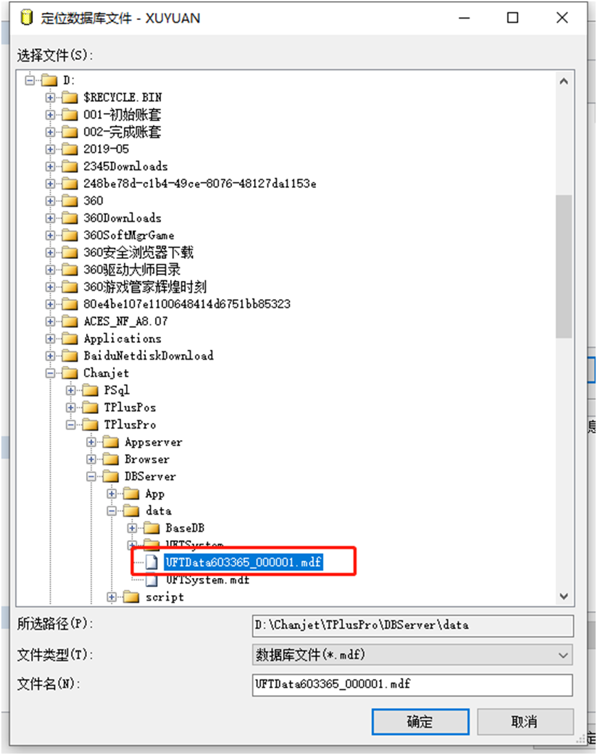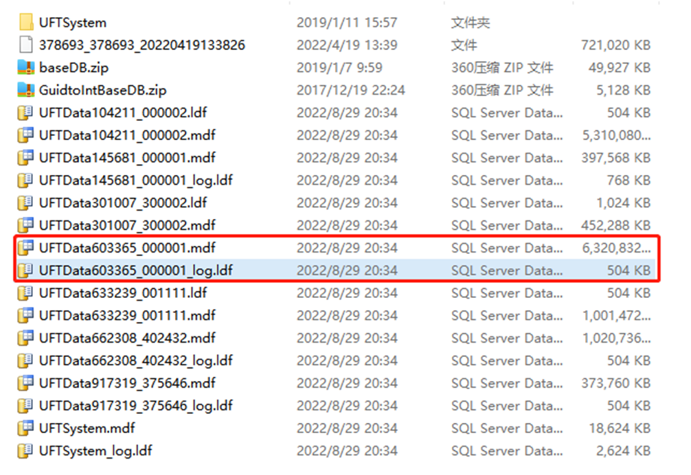 a、假设只保留了001帐套的帐套库文件,以下图中的帐套库为例,帐套库名称为UFTData603365_000001,将这两个文件放到D:ChanjetTPlusSTDDBServerdata(软件安装在D盘)。