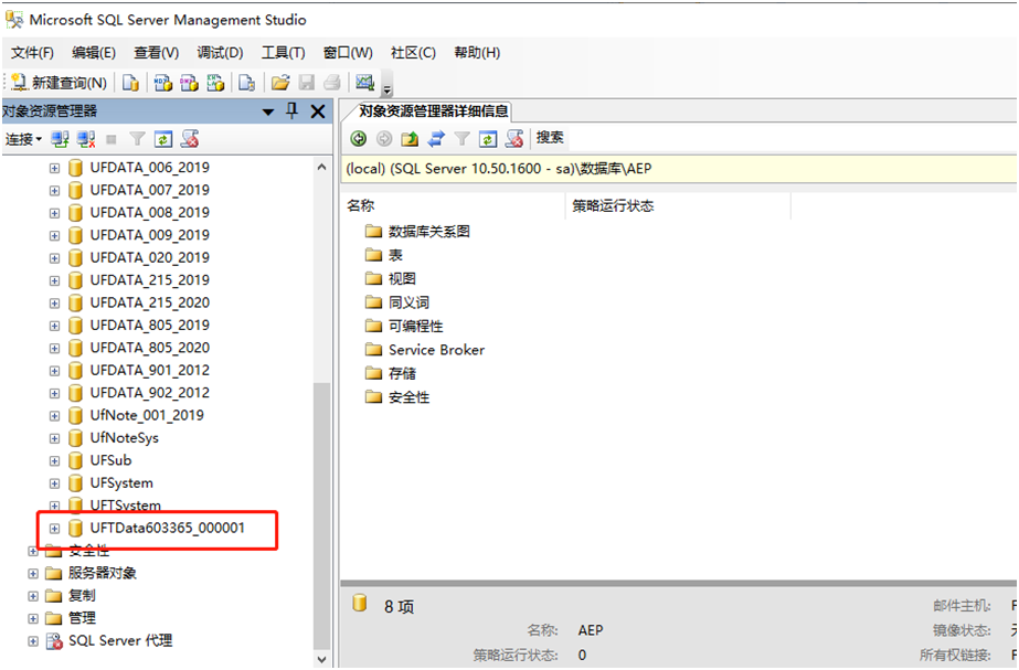 点击“确定”,附加完成后,数据库中就能显示该帐套: