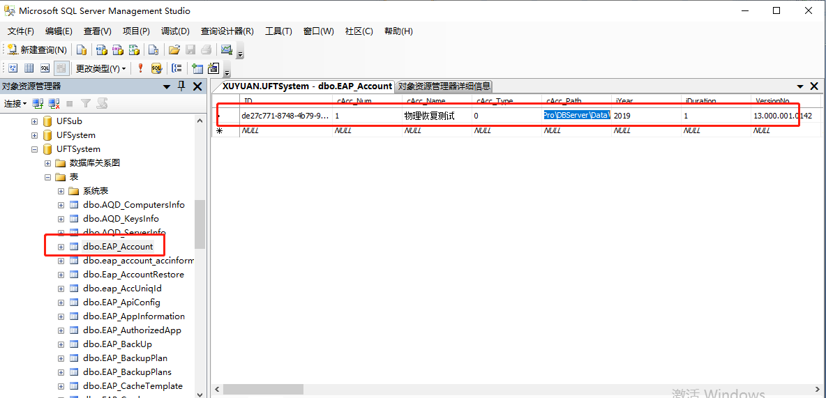 只将帐套库文件附加进来,在登录的时候是选择不到这个帐套的,软件的“帐套维护”中也不会显示,因为这个帐套在系统库中没有对应的记录,一般情况下,新建了帐套之后,数据库中的系统库里会有这个帐套的记录,记录的数据库表为uftsystem中的EAP_Account中,如下图: