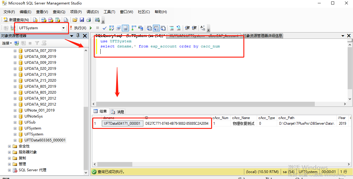 将该帐套的dsname值修改为附加帐套库的名称UFTData603365_000001: