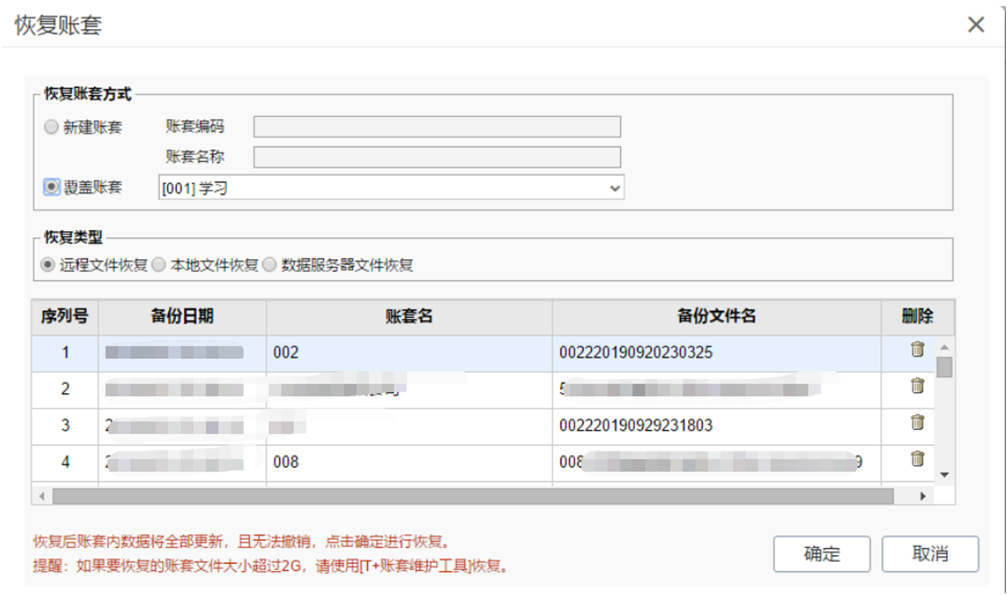 覆盖帐套:恢复某个帐套时,可以将软件中已存在的某个帐套覆盖掉恢复进来,被覆盖帐套就不再显示。