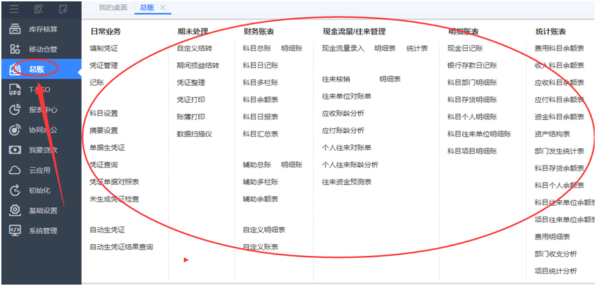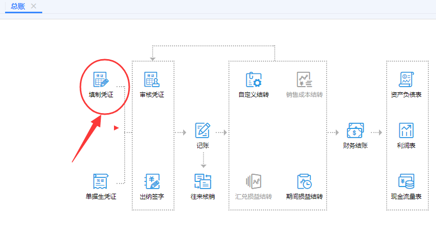 进入之后点左边的总账菜单,然后就会弹出总账处理的流程图,鼠标放在总账菜单上的时候,也可以看到好多菜单,点下去,右边就会弹出流程图。