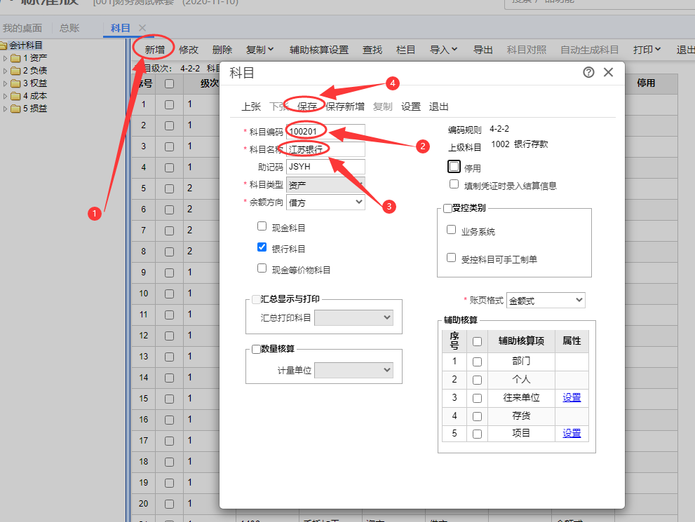 如下图的操作,打开“科目”,点增加,然后输入一级科目编码1002,二级编码是两位数,那就是100201,名称是江苏银行,然后点上面的保存即可,以后再有就接着编100202 100203等等。。。当然有些二级科目也不一定要在这里添加,在做凭证的中途发现没有明细科目也可以直接点编辑添加的,下面填制凭证的时候我们具体会说到。