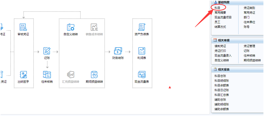 这个是整个财务处理的流程,在最右边有一个会计科目的菜单,软件使用之前,有些科目是需要设置二级科目的,如“银行存款”、“管理费用”“主营业务收入”等等,我们把常用的先设置二级科目,防止不小心直接用了一级科目,以后无法增加。譬如“银行存款”的科目编码是1002,那在下面加一个二级科目100201:江苏银行。这样就核算到明细科目了,加一个之后,以后再有新的直接往下加就可以了,那些不常用的科目,暂时没有发生,也不知道加什么二级科目的,也可以暂时不加,等需要的时候再加,只是要记住,有些科目假如下面有明细的话,第一次做凭证的时候,至少要加一个二级科目。