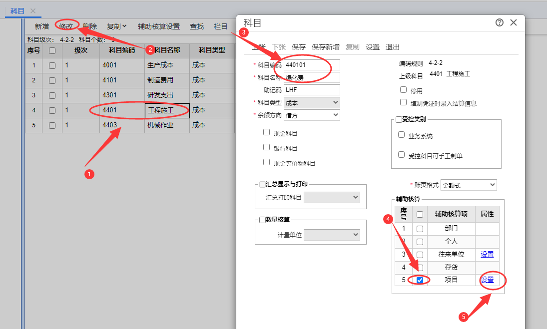 项目分类加完,就可以设置项目辅助核算了,跟往来单位一样,点开需要设置项目核算的科目,这里我们距离4401工程施工,这个是一级科目,我们加一个二级科目:140101绿化费,然后把二级科目设置项目关联,右边勾选项目-----然后点设置