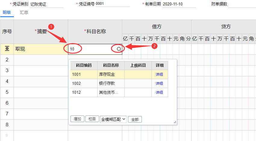 直接点菜单打开,默认是新增界面,1号处是凭证号码默认的1号开始流水,不需要修改。2号处是凭证的日期,这里可以直接修改,但是如果你改的日期跨月了,凭证号码也会变动的,每个月都是从1号凭证开始的,这里就需要登录的时候操作日期的配合了。3号处是附单据数,就是这张凭证后面附了几张发票等单据。4处是凭证摘要,这里可以直接打字,也可以从后面的放大镜点开选择。