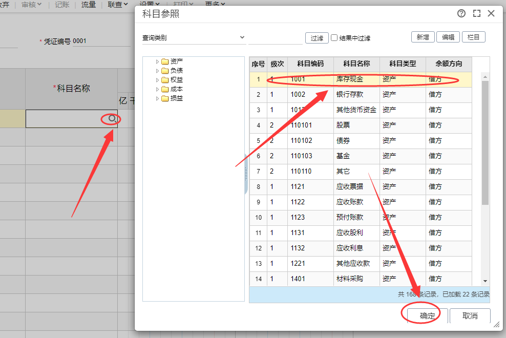 下面就是选择科目,你如果记得科目编码直接输入编码敲回车,不记得编码,可以点一下,然后点后面的放大镜选择