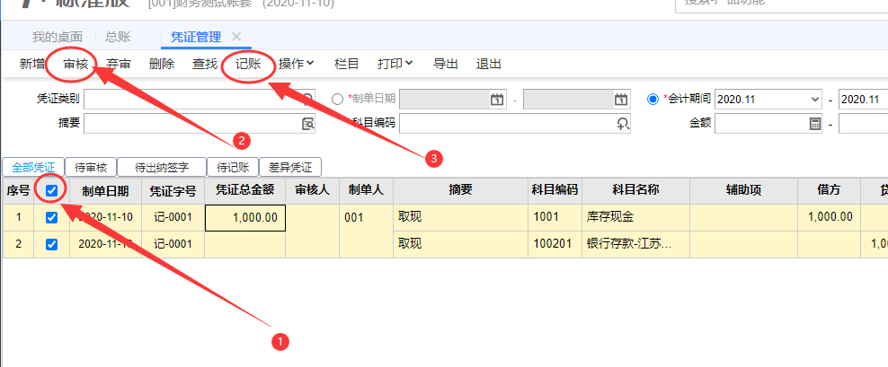 然后点确定,点1号地方,可以选中全部凭证,或者一张张勾选,然后点上面的审核,就可以批量审核了,审核完之后的记账也在这里,点一下记账就完成记账了,当然审核和填制凭证的人不能为一人,得还一个操作员操作。