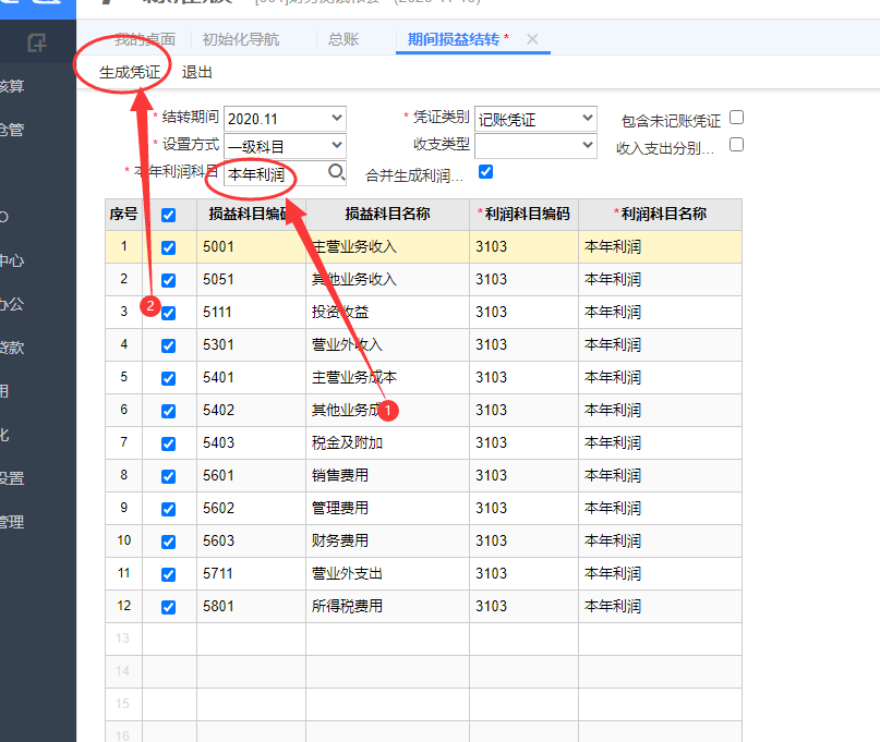 设置完本年利润科目就可以点上面的“生成凭证”了