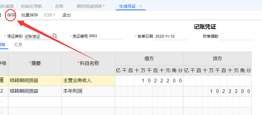 期间损益结转就完成了,这又是一张新的凭证,同样需要再次登录做审核、记账。