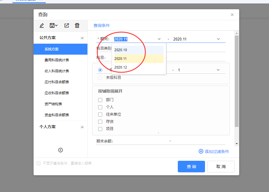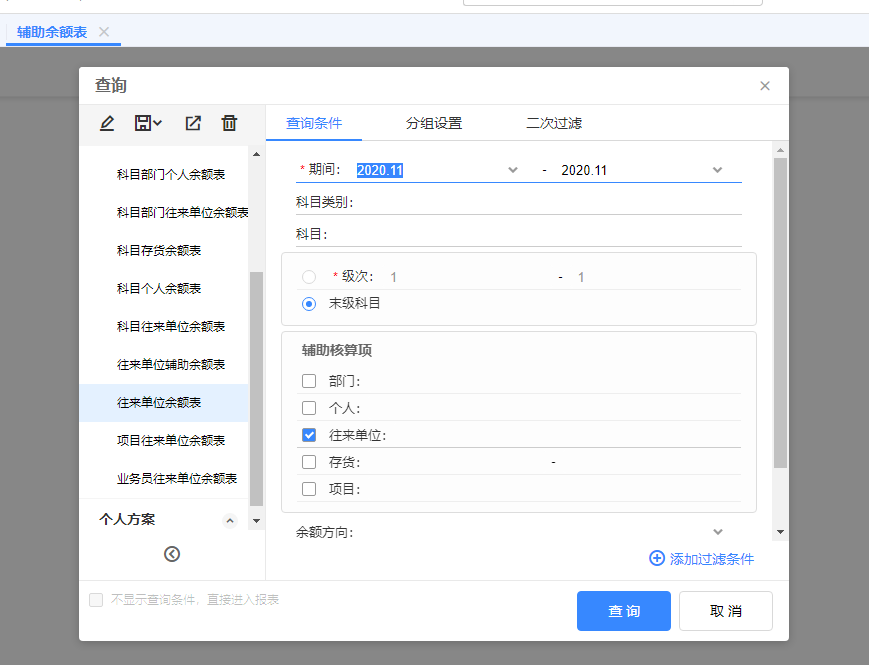 其他报表也是一样的查询方法,这里就不再详细叙述了,不同的是辅助核算的,需要勾选下面的核算项目,然后查询。你也可以点右边的辅助余额表或者辅助明细账,是包含所有辅助项目的报表,包括单位往来或者项目核算的