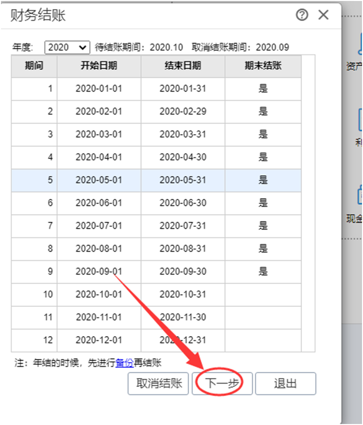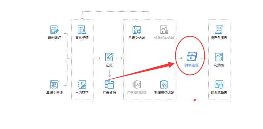 全部做完之后当月要进行月末结账,直接点最后的月末结账,即可,一直下一步下一步到最后点结账。