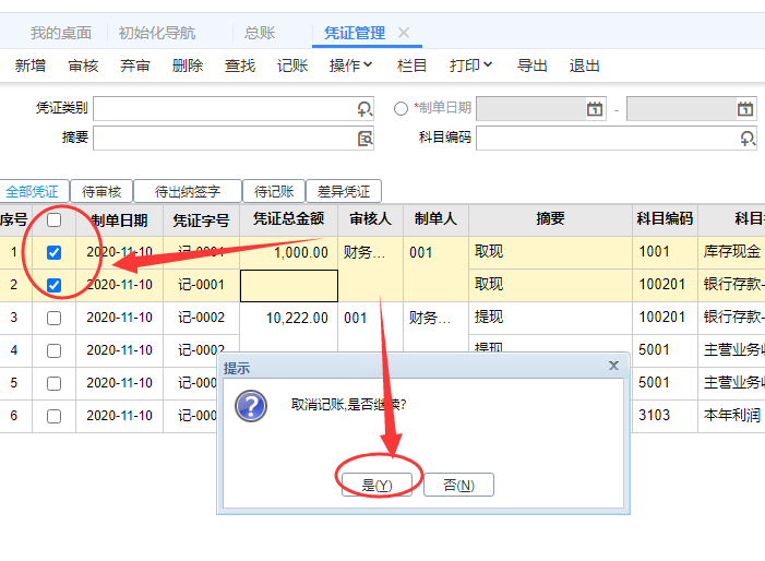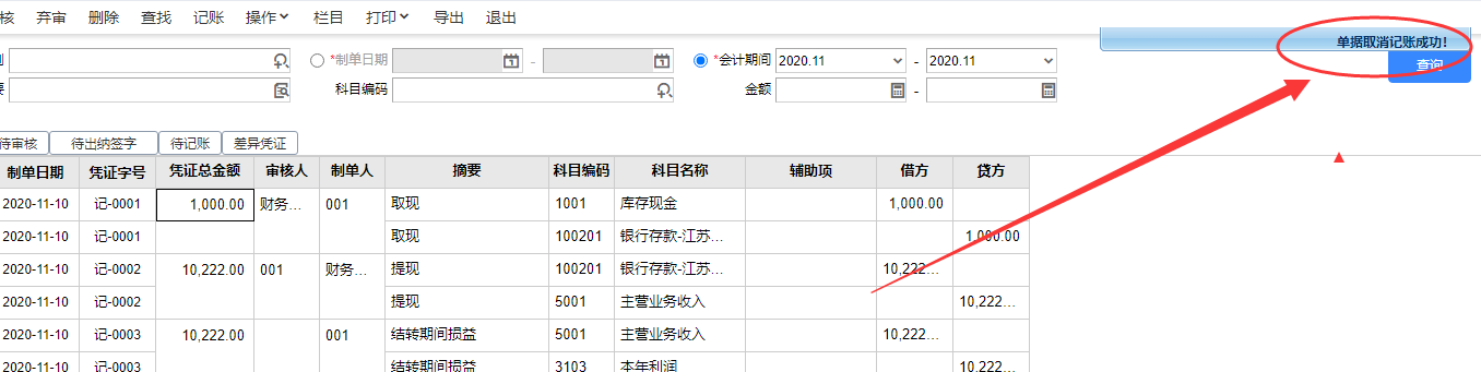 取消记账:打开凭证审核------勾选全部或者需要取消记账的凭证,然后按键盘的ctrl+alt+H三个键,就会提示,你点是即可。