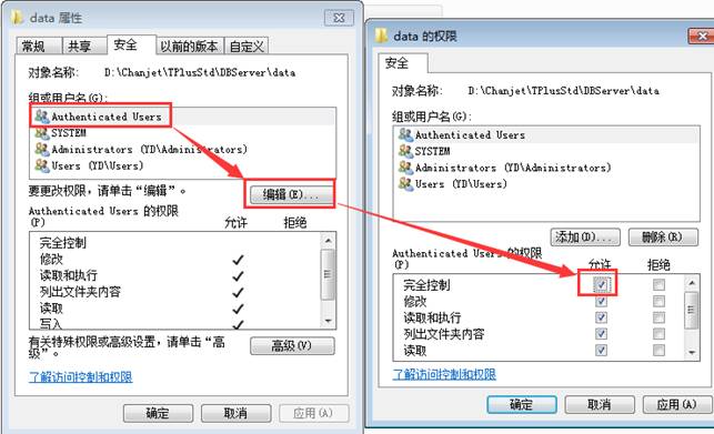 鼠标右击属性,选择Authenticated Users,点击编辑,把对应的完全控制打上勾并确定,如图下: