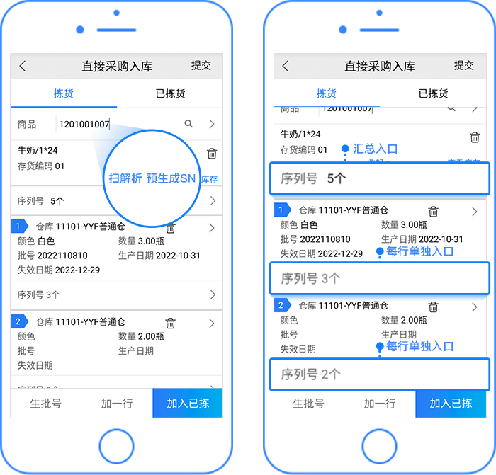 【拣货验货支持多明细行】选中时,在入库的拣货页面,支持直接扫“预生成、解析”的序列号直接带出商品,解析序列号的解析规则中必须带有存货。不必先扫存货再到“序列号录入页面”逐个扫描SN。