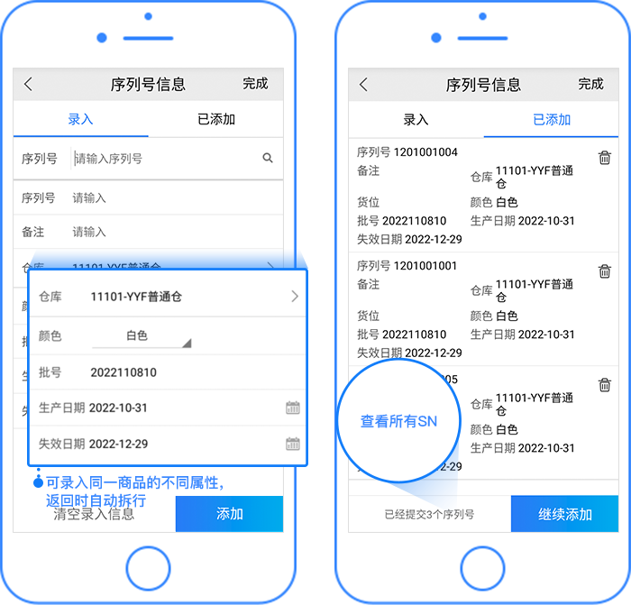 从拣货页总SN入口进入时,允许添加当前拣货商品的不同批次等属性的SN,返回拣货页面时会根据录入的属性值不同自动拆行、合并行。