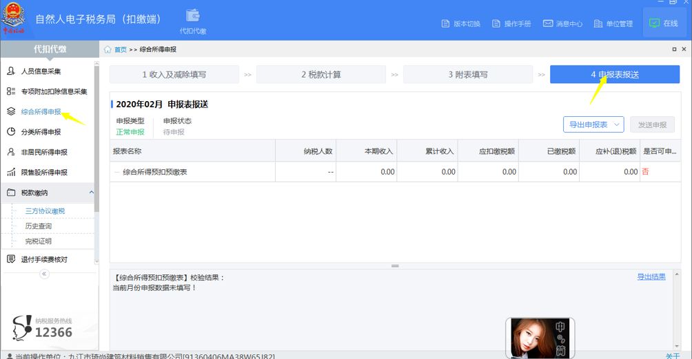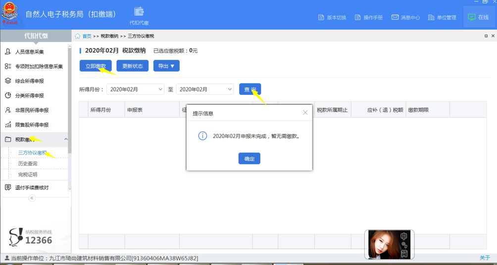 点击税款缴纳下三方协议缴税,选中报表,点击立即缴款即可发起缴税业务。在此之前,需要核对三方协议的开户行、账户名。核对无误,点击确认扣款发起扣款,进度条刷新完毕后得到缴款结果,完成整个个税申报。