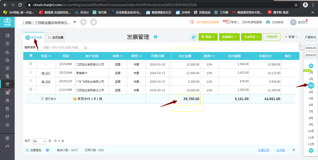 可得出:印花税申报表中“购销合同”的计税金额=发票管理中销项发票“合计金额”这列的合计数=39700;