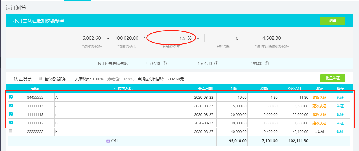3、进入【发票管理】-【认证测算】,输入所属行业在当地的平均税负率,点击【测算】,即可知晓当期预计还需抵扣的进项税额,并自动出具建议认证的发票列表。