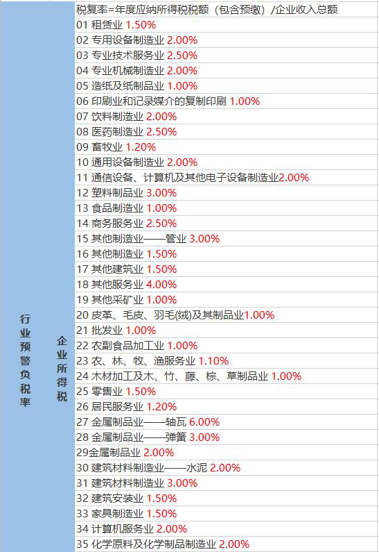 2020年各行业“预警税负率”