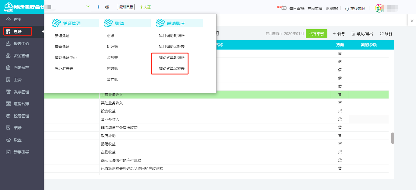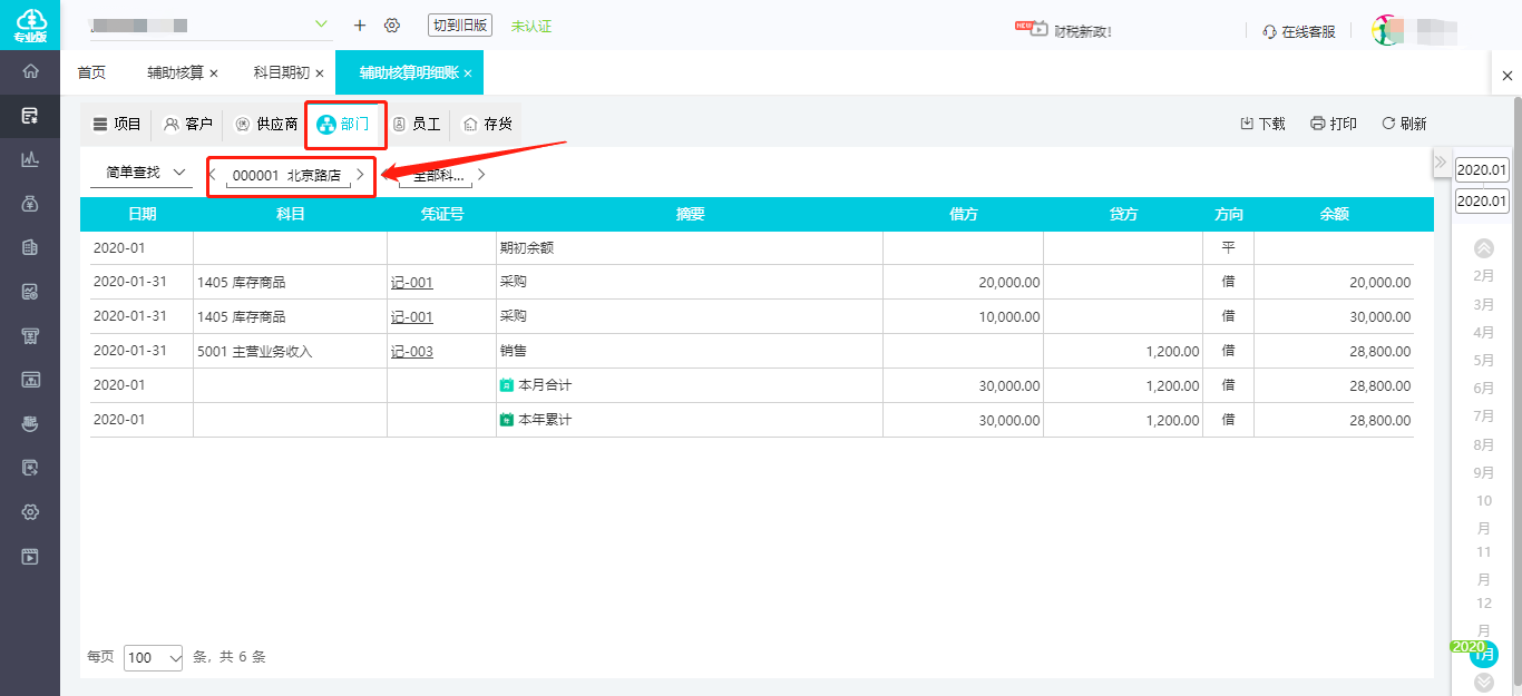 ③各门店收支可通过查询辅助余额表/辅助明细账获取详细资料。依次点击【总账】-【辅助核算明细账】/【辅助核算明细表】。选择需要查询的门店/科目,数据一目了然。