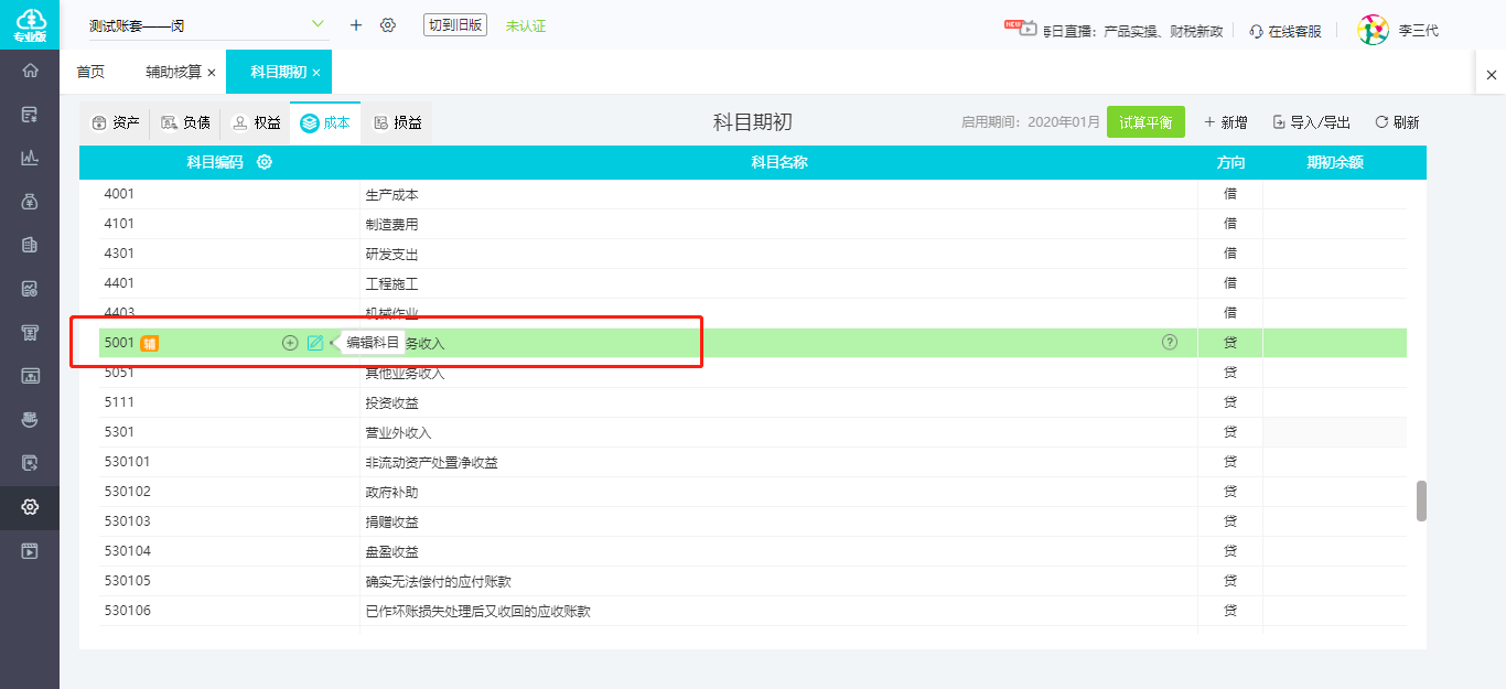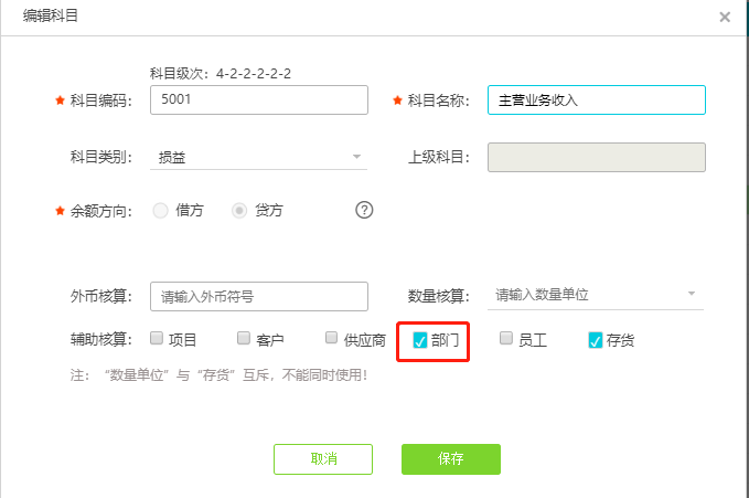 ②各门店相关收支科目挂上部门辅助核算项。如:主营业务收入、应收账款等。依次点击【设置】-【科目期初】-选择相应会计科目-【编辑】-勾选【部门】辅助核算。