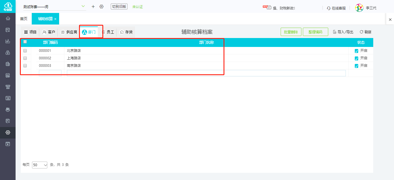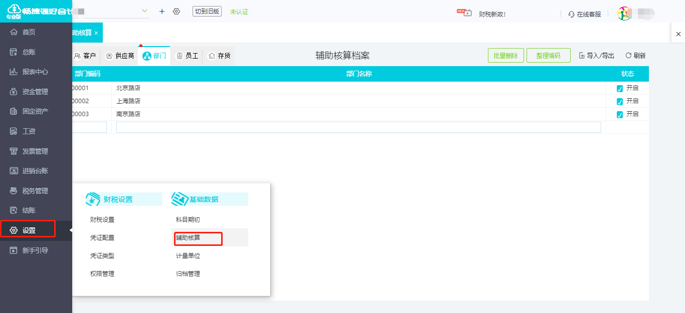 ①编辑部门辅助核算档案。依次点击【设置】-【辅助核算】-【部门】-填写连锁店名称编辑辅助核算档案。