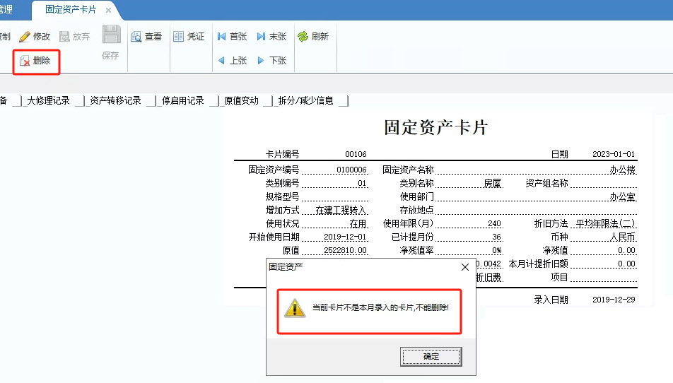 进而验证了【当前卡片不是本月录入的卡片,不能删除】,所以删除时针对录入日期为本月的卡片才可以删除。