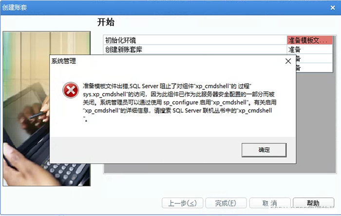 用友U8+在新建账套的过程中,初始化环境,提示准备模板文件出错,SQL Server 阻止了对组件xp_cmdshell的过程sys.xp cmdshell的访问,因为此组件已作为此服务器安全配置的一部分而被关闭。