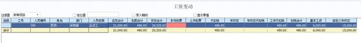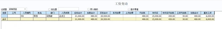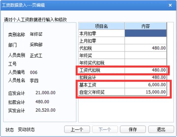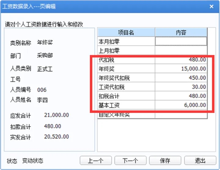 例:一月份公司给李四发放基本工资6000、年终奖15000,年终奖使用并入综合所得的方式计税,在工资项目【基本工资】上录入6000,在【自定义年终奖】上录入15000,得到工资代扣税为480。
