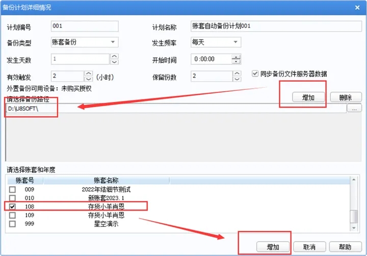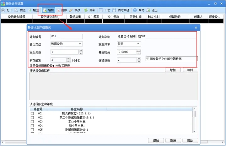 5、【备份计划详细情况】界面下方点击【增加】选择备份路径,并在下方勾选需要备份的账套号即可,最后,点击最下方的增加按钮保存好设置。