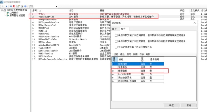 1、定时服务是否启动: U8应用服务管理器--定时服务--账套备份