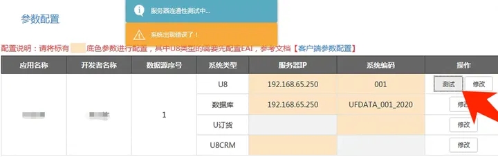 开放平台客户端进行参数配置的时候,数据库连接是通的,但是u8地址修改后点击保存测试提示报错:系统出现错误了!