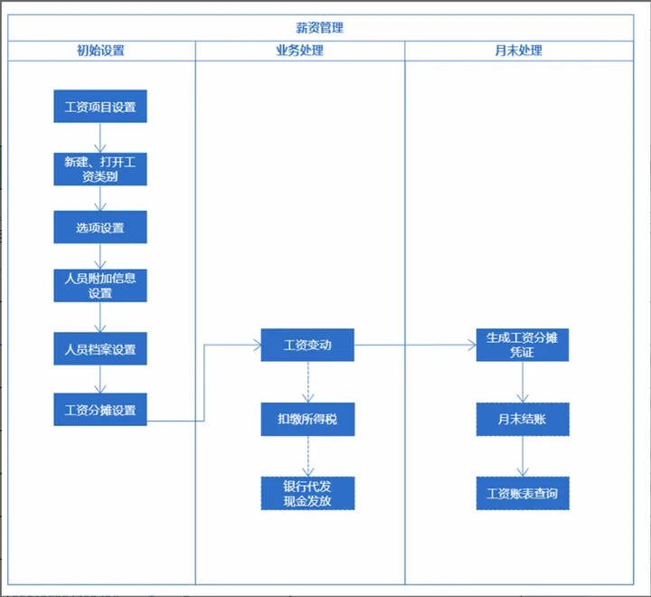 薪资管理日常业务:录入工资数据,计算汇总工资数据,生成工资分摊凭证,月末结账。