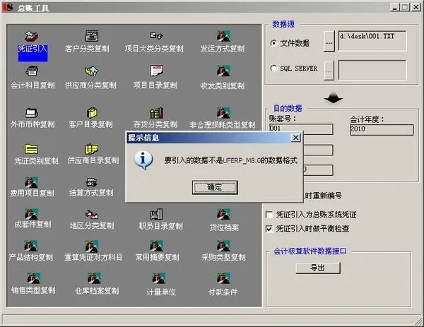 用友U8 V10.0的总账工具导入TXT文件凭证,提示“要引入的数据不是UFERP_M8.0数据格式”。