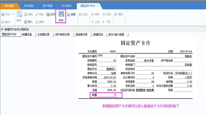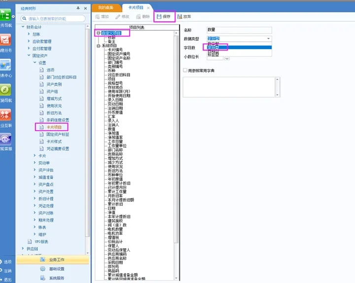 一、固定资产-设置-卡片项目中增加自定义项目,设置名称,数据类型一般选择字符型。(以数量为例)