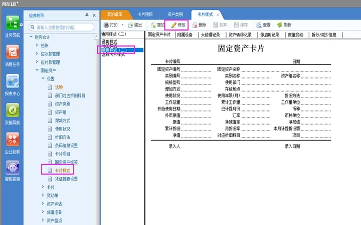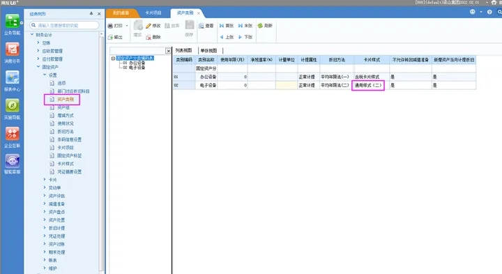 2、固定资产-设置-资产类别节点查看需要调整的资产类别所对应的卡片样式;
