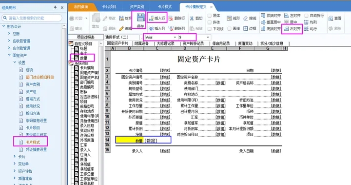 三、卡片样式中选择要调整的样式点击修改。选中表体行点击插入行,空白处双击左边自定义项目数量,调整字段字体,一般系统预制为Arial 9号字体。